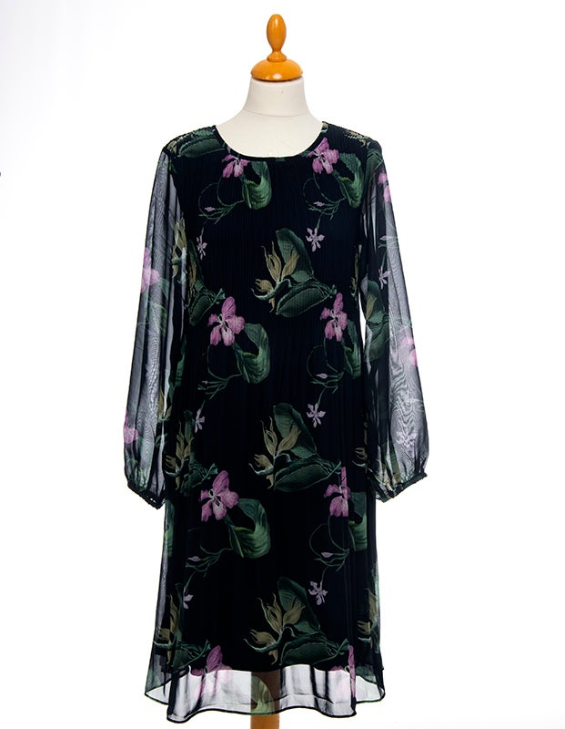 STI:n hihallinen mekko levenevällä helmalla. kukka kuviolla