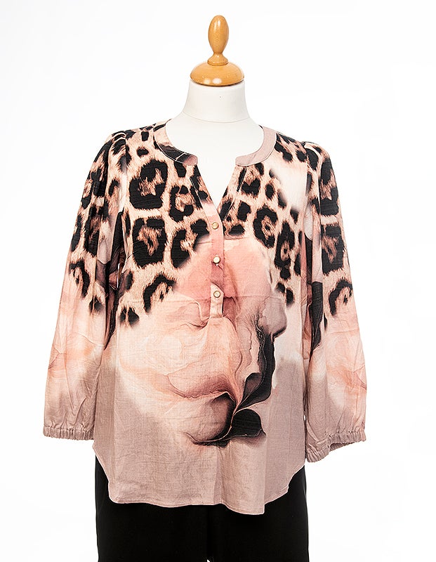 In Frontin kukkakuvioinen pusero. Napitettava kaula-aukko