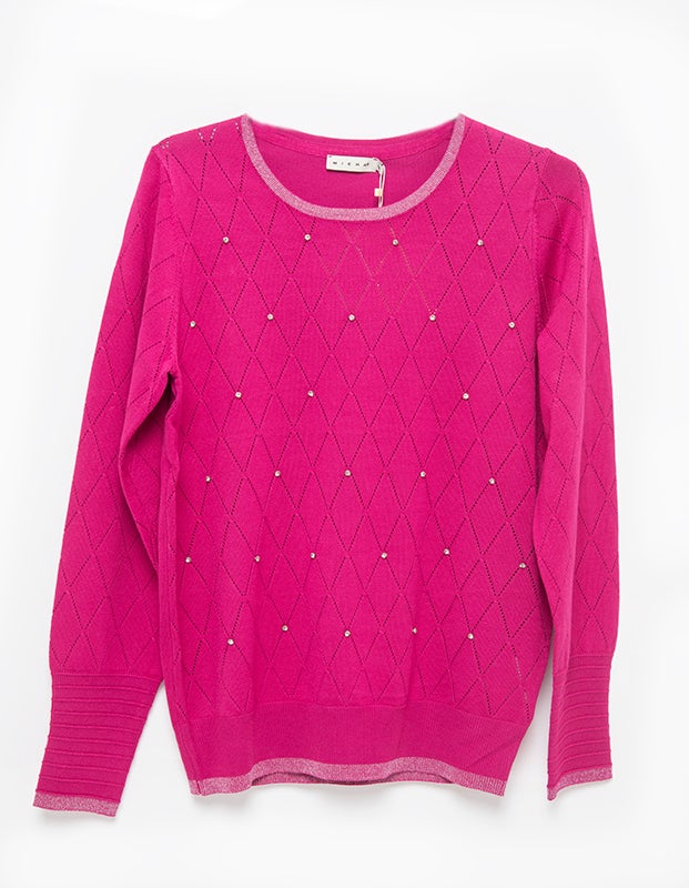 Kaunis Michan neule koristeellisella timanteilla. Pohjana salmiakkikuvioinen pinkki kuviointi jossa timantteja. Kaula aukossa koriste.