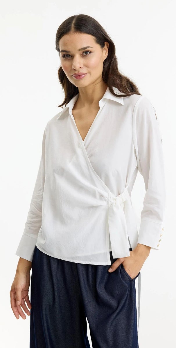 In Frontin luonnonvalkoinen kietaisupusero kauluksella. Puserossa on 3/4 hihat ja hihansuissa kaunis kultainen nappirivi.