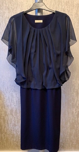 Cara Modan tummansinen mekko. Yläosassa sifonginen pusero ja alaosa hame.